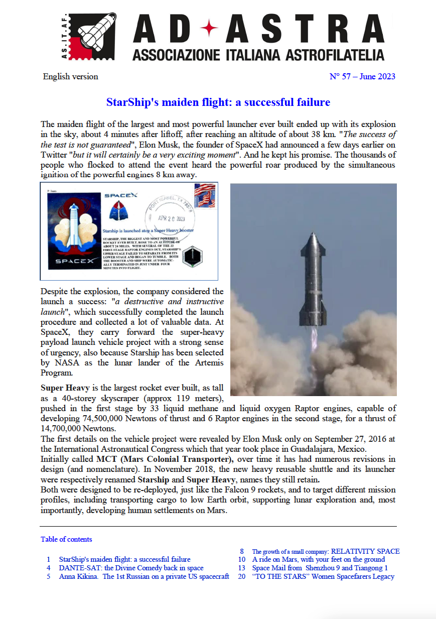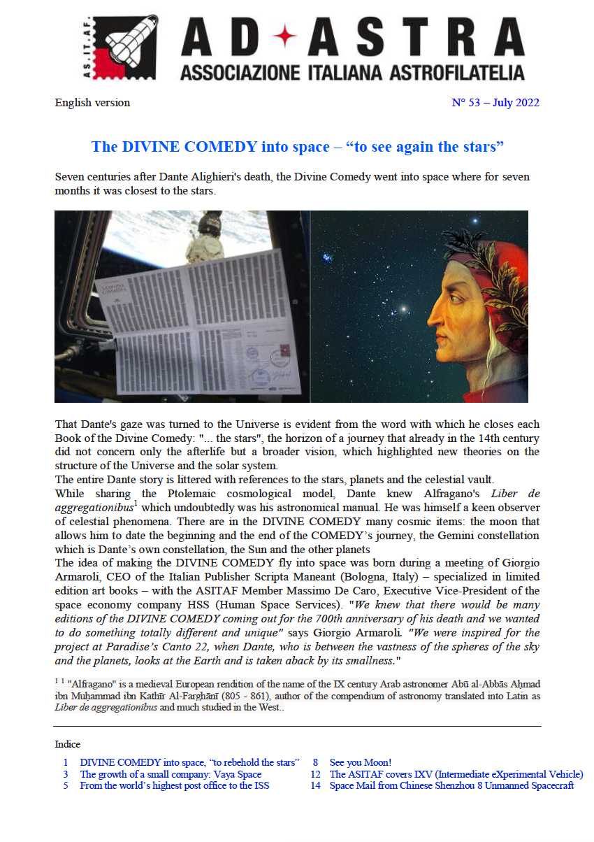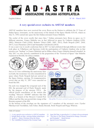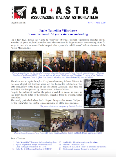 AD*ASTRA , the quarterly Journal of AS.IT.AF. provides information – both in Italian and English – on the main astrophilatelic and space events, with a special focus on Italy. Twenty five per cent of the Members are from outside.